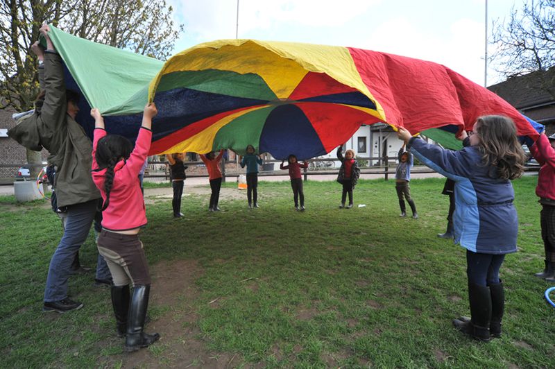 Beim gemeinsamen Pizza backen, Trekker fahren oder spielen auf der Weide und dem Spielplatz (im Sommer mit Hüpfburg) lernt jedes Kind schnell neue Freunde kennen. Und Aktionen wie Sattelpflege, Stallgasse kehren oder gemeinsames „Abäppeln“ der Weiden mit Schubkarre, Äppelboy und Harke runden den Ferientag auf einem Reiterhof ab.